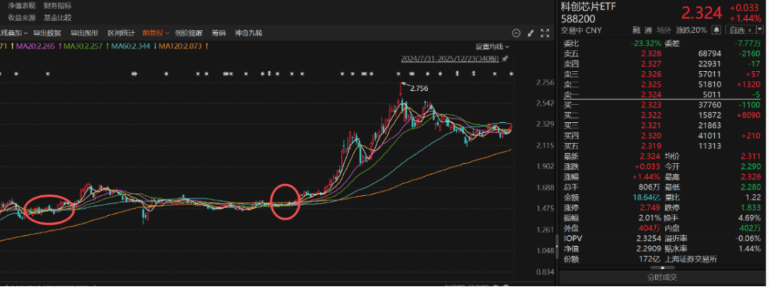 当然,缺点是利用均线来做波段操作在震荡市中容易出现大量的假信号,比如上图第一个红框,ETF走势长期围绕着中长期均线窄幅波动,如果止损线设置得过小,容易出现连续的小额亏损。
