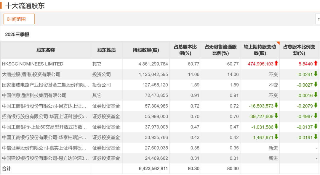 类似的还有中芯国际,截至9月底,前十大流通股股东中有6只ETF。