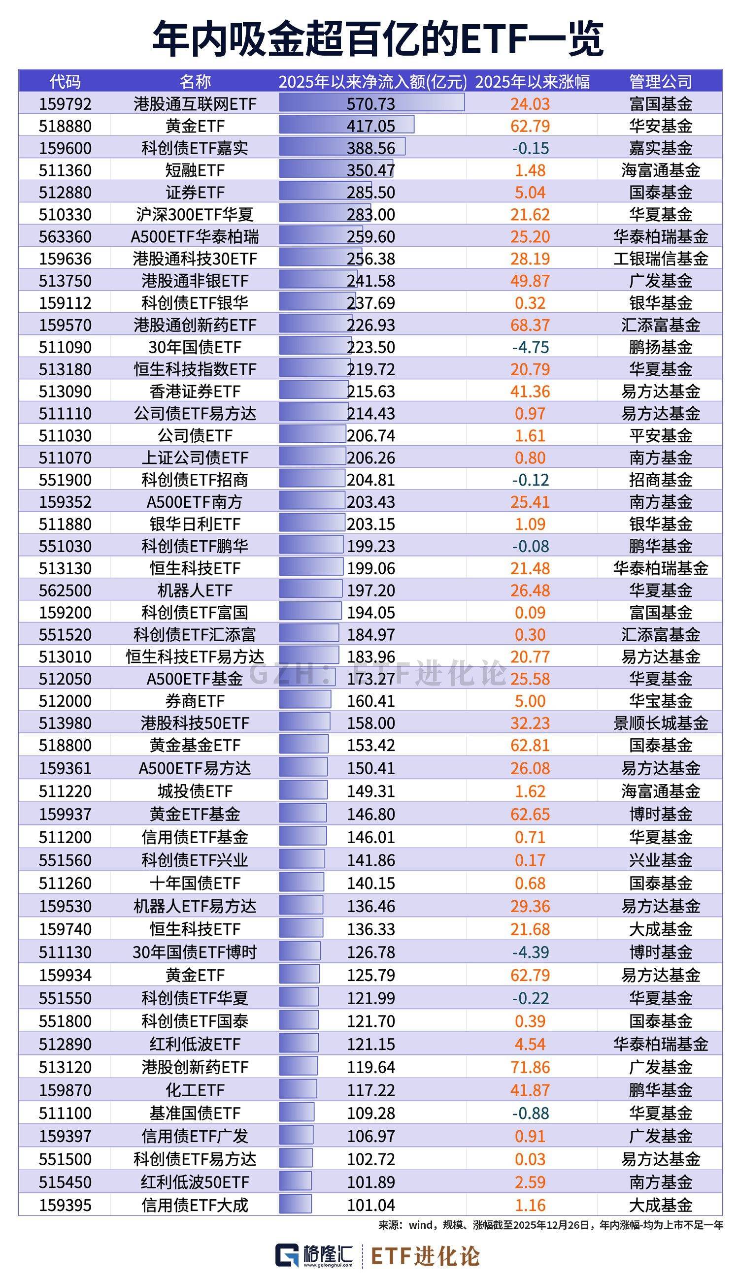 港股通互联网ETF成为年度“吸金状元”,狂揽570.73亿元;全球避险情绪浓厚之下,黄金ETF紧随其后,吸金417.05亿元;作为“牛市旗手”的证券ETF与香港证券ETF,也均有超200亿元的资金涌入。