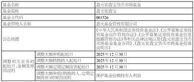1、自2025年12月30日起,鑫元安鑫宝货币市场基金大额申购(转换转入、定期定额投资)业务限额调整为: