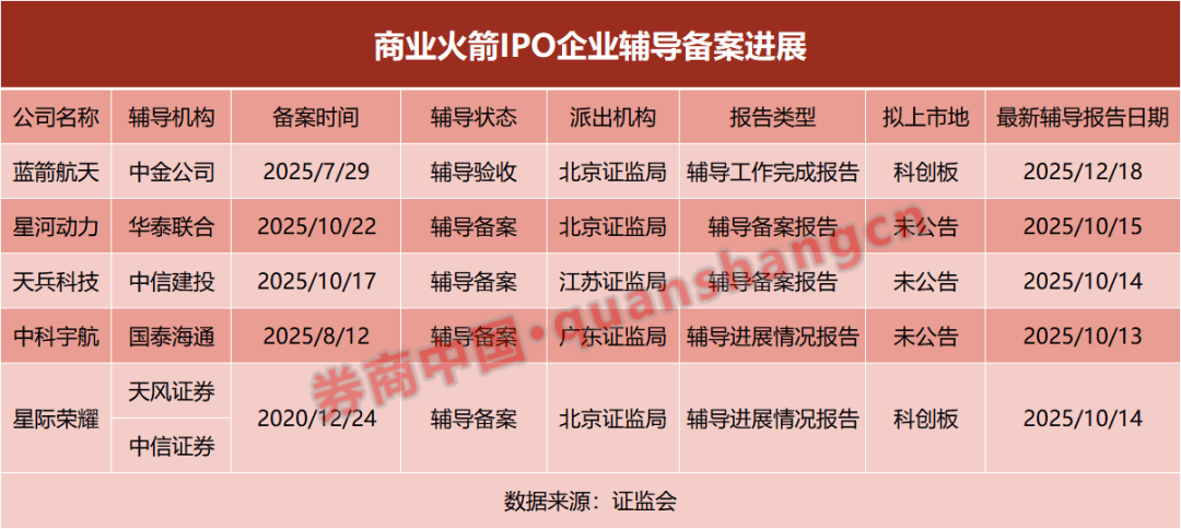 根据券商中国记者不完全统计,至少有5家商业火箭企业明确要在A股上市且已进入IPO辅导工作,但各企业辅导进展不一。