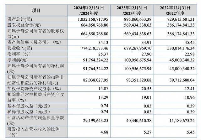 业绩方面,2022年至2024年,新恒泰营业收入分别为5.3亿元、6.79亿元、7.74亿元,净利润分别为4500.03万元、1.01亿元、9176.43万元,毛利率分别为22.98%、27.9%、25.37%。