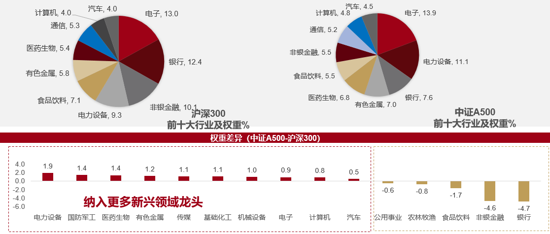 反映在行业分布结构上,中证A500指数在非银金融、银行、食品饮料行业的权重较沪深300合计降低了约11%,这11%的权重被均匀分配至其他新兴行业,使得指数的行业分布与A股整体行业权重更为一致,代表性也更强。这些权重主要分配至电力设备、军工、医药生物、有色金属、传媒、化工、机械设备等行业,这些行业是A股的中流砥柱,多偏向制造业,与我国资本市场扶持实体经济的定位高度契合。