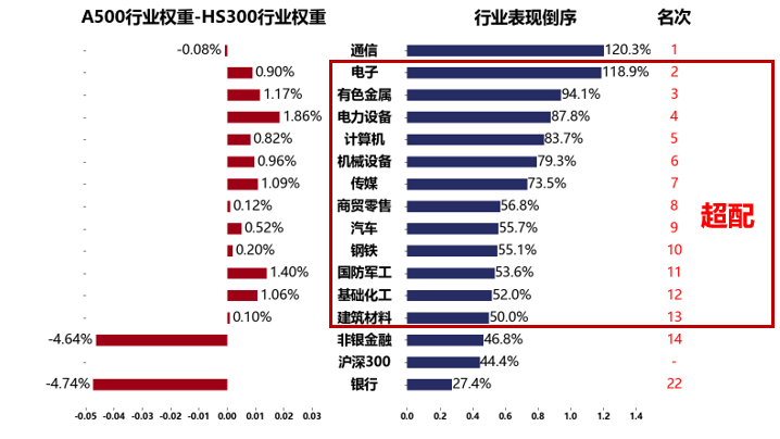 此外,从结构上能看出其更优的行业配置能力:2024年9月23日至2025年10月31日期间,有14个申万一级行业的涨幅超过沪深300指数,中证A500指数仅在非银金融和通信行业相对沪深300指数分别低配4%和0.08%;通信行业低配主要是因为2025年10月31日该行业出现较大幅度回调,导致其权重较其他行业有所下降,但近期权重已有所回升,整体配置权重仍高于沪深300指数。而在剩余12个行业中,中证A500指数相对沪深300指数均为显著超配,合计超配幅度超过10%,低配行业腾出的权重全部转向了电力设备、电子、有色金属、机械设备等更具竞争力的行业。这些行业既是A股的中流砥柱,也是今年以来表现突出的领域——例如电子、有色金属均为今年的强势板块,电力设备行业表现也十分亮眼。