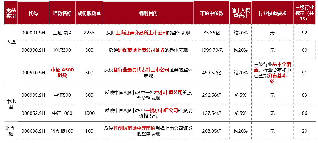 接下来我们分析中证A500指数与其他宽基的生态位差异:中证A500指数是大盘宽基指数,对标沪深300并在其基础上做了一定增强;大盘宽基包括上证综指、沪深300、中证A500,中小盘则有中证500、中证1000,此外还有科创板等代表独特板块的指数。