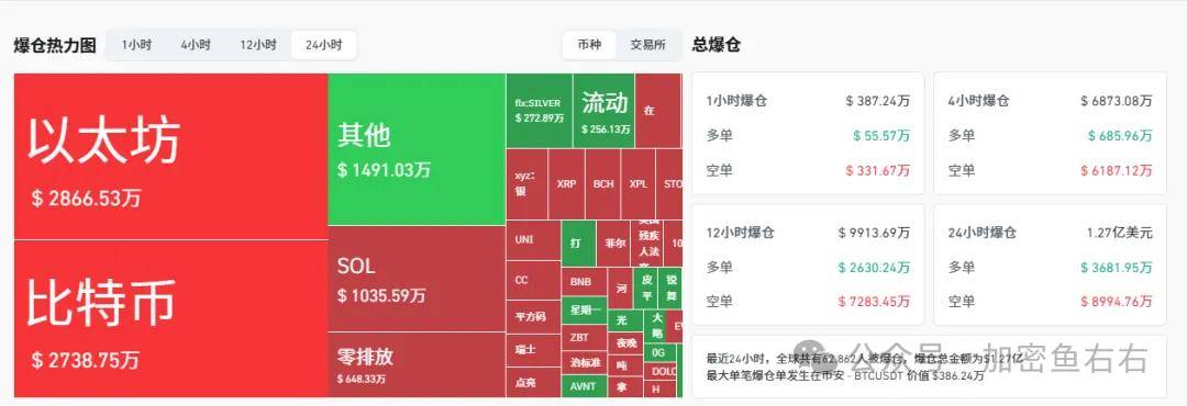 最近24小时,全球共有62,882人被爆仓,爆仓总金额为$1.27亿!周末山寨乱飞,开始群魔乱舞,主力悄摸声息的开始布局新一轮的收割计划了。