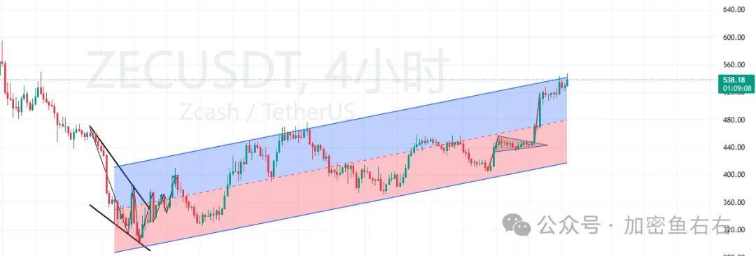 ZEC当前价格接近上边沿线压力位,短期有回调需求,之后会再次开始上涨。整体趋势属于这段属于二次上涨行情,距离次高点还要一段距离,所以近期继续看涨,只有突破次高点之后价格才能再创历史新高。