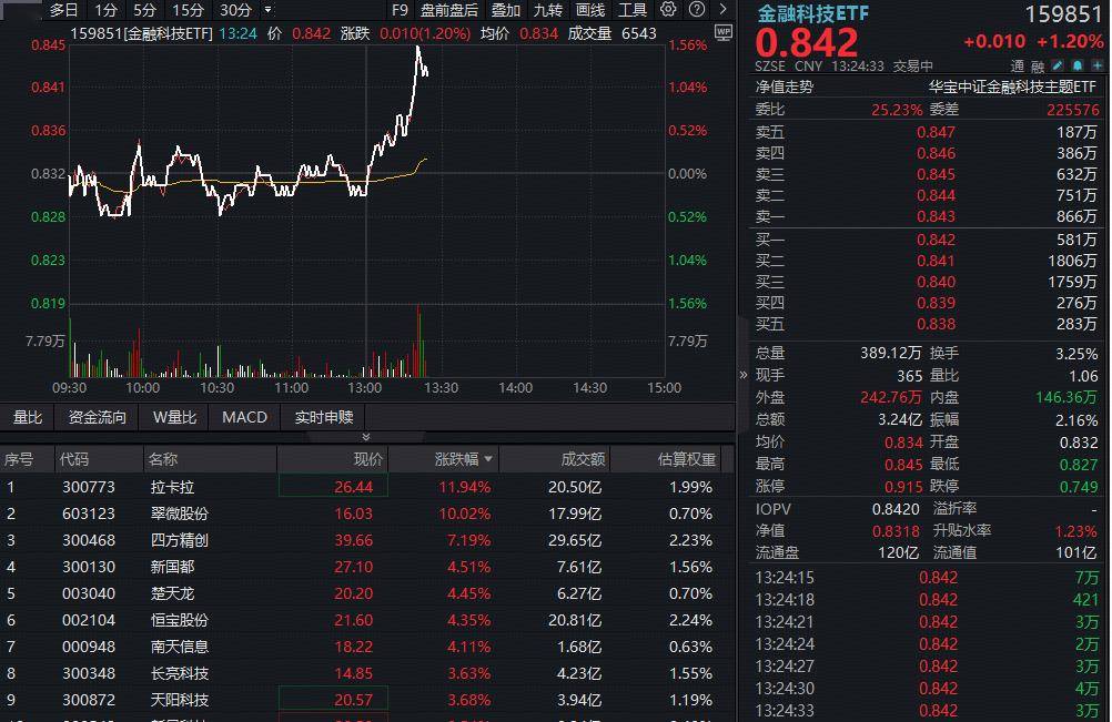 29日午后,金融科技板块再次冲高,数字人民币概念活跃,拉卡拉领涨超12%,翠微股份直线涨停,四方精创涨超7%,新国都、楚天龙、长亮科技、天阳科技、飞天诚信等多股涨超4%。热门ETF方面,同类流动性最佳的金融科技ETF(159851)场内拉升逾1%,冲击日线四连阳,实时成交额超3亿元。