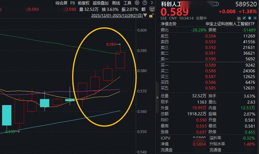 今日(12月29日)早盘,字节产业链含量33%的科创人工智能ETF(589520)早盘强势,场内价格一度涨超1.8%,现涨1.38%,盘中收复60日均线,冲击日线4连阳!