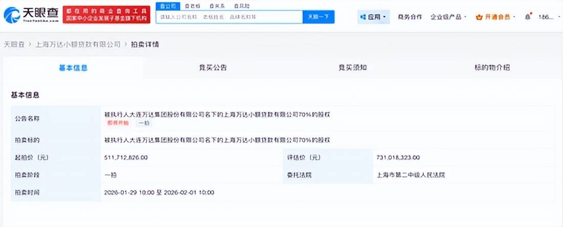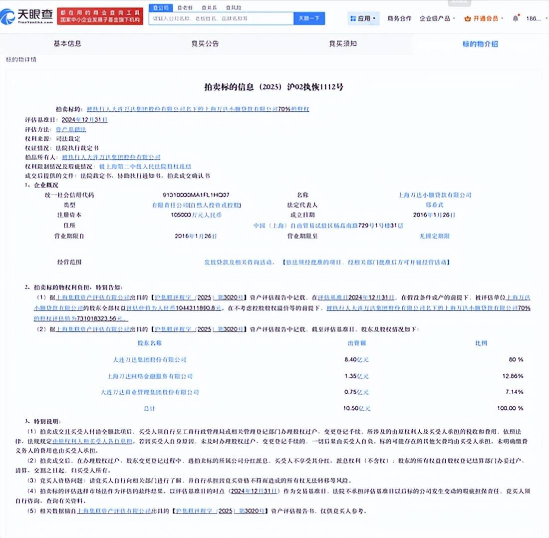 日前,上海市第二中级人民法院发布拍卖预告,大连万达集团股份有限公司(下称万达集团)持有的王健林的(下称上海万达小贷)70%股权将进入司法拍卖程序,该标的评估价7.31亿元,起拍价5.12亿元,拍卖时间为2026年1月29日-2026年2月1日。