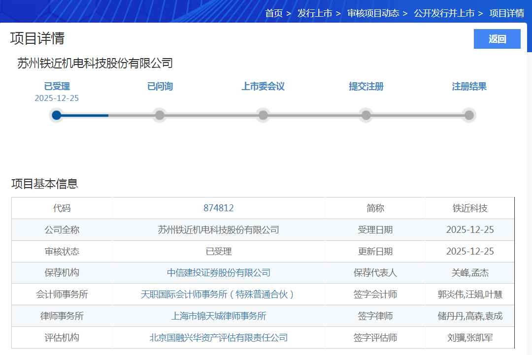 北交所网站显示,近日,苏州铁近机电科技股份有限公司(以下简称“铁近科技”)北交所IPO获受理,保荐机构为中信建投证券股份有限公司。