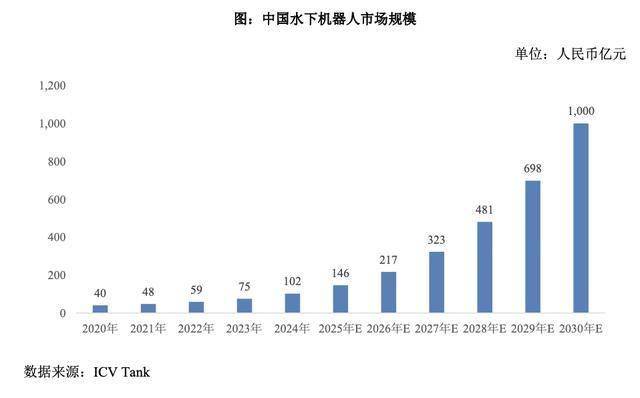 根据ICV Tank数据,2020年至2024年,中国水下机器人市场规模呈快速增长趋势。中国水下机器人市场规模从2020年的40亿元增长至2024年的102亿元,期间年复合增长率约为26.06%。随着缆控水下机器人、自主水下机器人及水下助推机器人等产品的应用市场持续拓展,未来中国水下机器人市场有望持续繁荣,未来中国水下机器人市场规模仍将保持快速增长,预计在2025年达到146亿元,并于2030年达到1,000亿元,自2025年至2030年的年复合增长率预期约为46.93%。