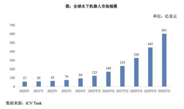 当前,水下机器人行业正处在快速发展的关键阶段,市场需求持续攀升,产业生态日趋完善。根据ICV Tank数据,2020年至2024年,全球水下机器人市场规模呈持续发展趋势。全球水下机器人市场规模从2020年的57亿美元增长至2024年的94亿美元,期间年复合增长率约为13.33%。未来,水下机器人渗透率有望持续提升,全球水下机器人市场规模仍将持续增长,预计在2025年达到123亿美元,并于2030年达到601亿美元,自2025年至2030年的年复合增长率预期约为37.29%。