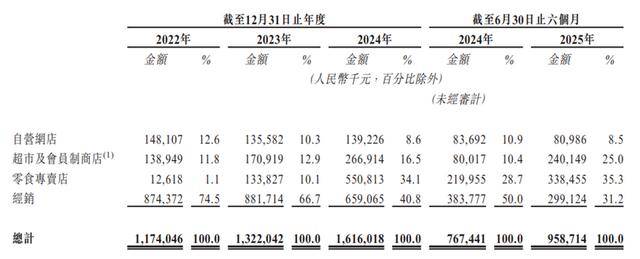 招股书显示,2022年至2024年,公司的收入分别为11.74亿元、13.22亿元、16.16亿元。收入增长的核心驱动力主要来自零食专卖店渠道,该渠道收入从2022年的1261.8万元暴增至2024年的5.51亿元,营收占比从1.1%跃升至34.1%。截至2025年6月30日,该渠道收入占比进一步升至35.3%,成为公司收入的最大渠道。
