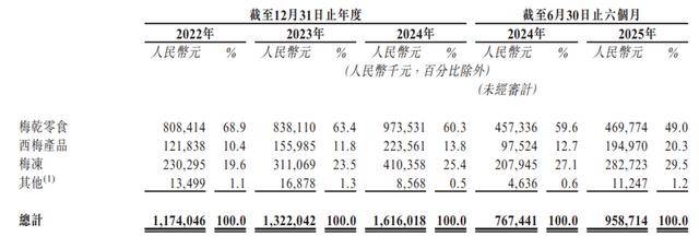 尽管溜溜果园官网宣称已形成“溜溜梅”“梅冻”“西梅纤生”“青梅制品”四大品牌矩阵,但招股书数据揭示了其“一颗梅子打天下”的路径依赖。