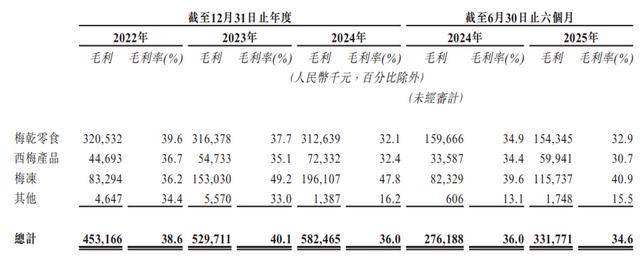 溜溜果园招股书中披露的盈利数据,暴露出其在产业链中的弱势地位与盈利结构的脆弱性。梅干类产品作为营收占比超60%的核心品类,毛利率从2022年的39.6%持续下滑至2024年的32.1%,盈利空间持续收缩。