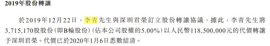 在红杉资本之后入股的另一早期自然人股东李青于2016年10月以1.03亿元入股,2019年将所持371.52万股股份(占公司股权的5%)转让予深圳君荣,并套现约1.19亿元。