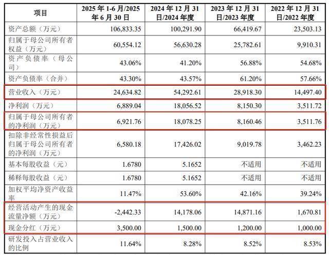 业绩方面,2022年至2024年及2025年上半年(以下称报告期内),猎奇智能营业收入分别为1.45亿元、2.89亿元、5.43亿元和2.46亿元,归属于母公司所有者的净利润分别为3511.76万元、8160.46万元、1.81亿元和6921.76万元。