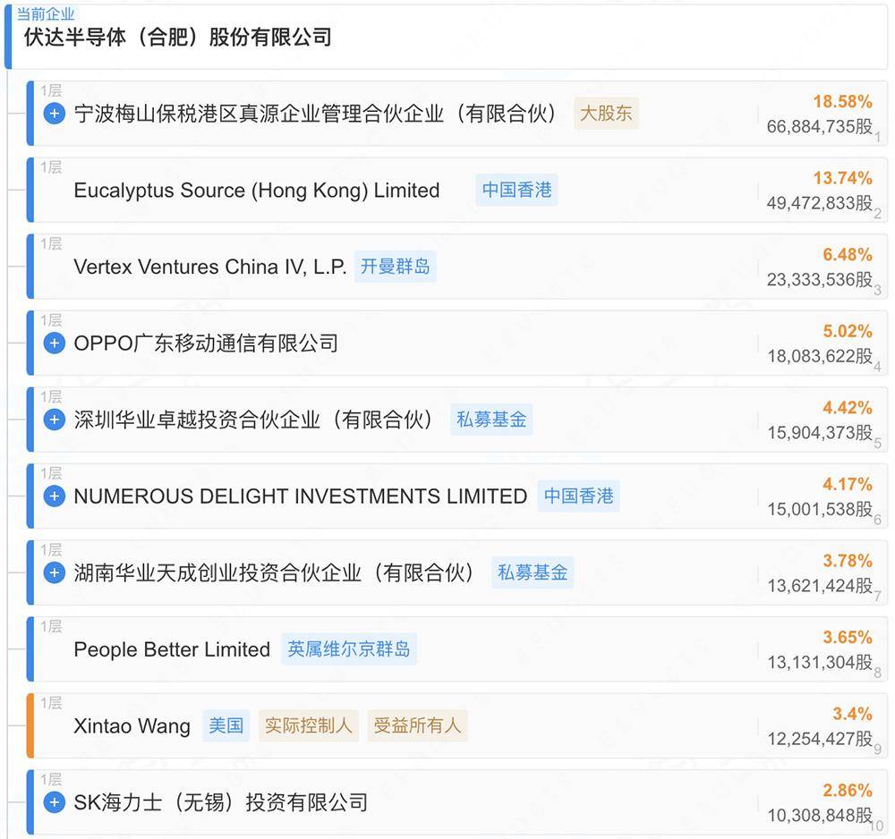 企业信用查询平台企查查显示,伏达半导体第四大股东OPPO持股5.02%,第十大股东SK海力士(无锡)投资有限公司持股2.86%。