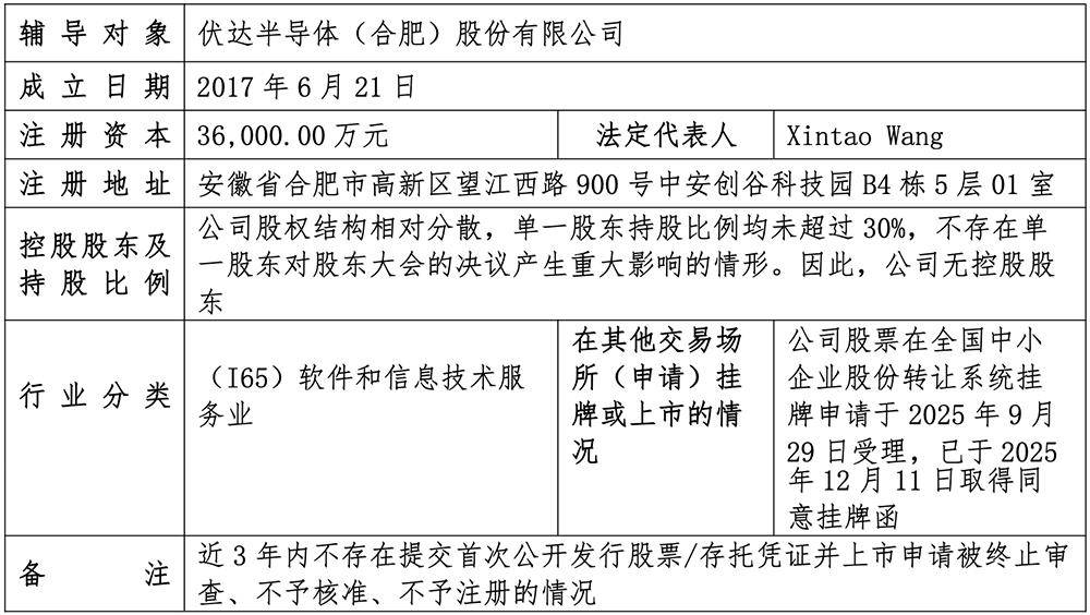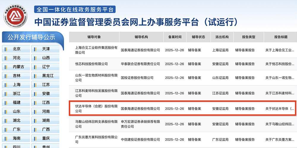 芯东西12月29日报道,12月26日,证监会官网显示,安徽合肥电源管理芯片公司伏达半导体在安徽证监局办理上市辅导备案登记,启动A股IPO进程,辅导机构为国泰海通。