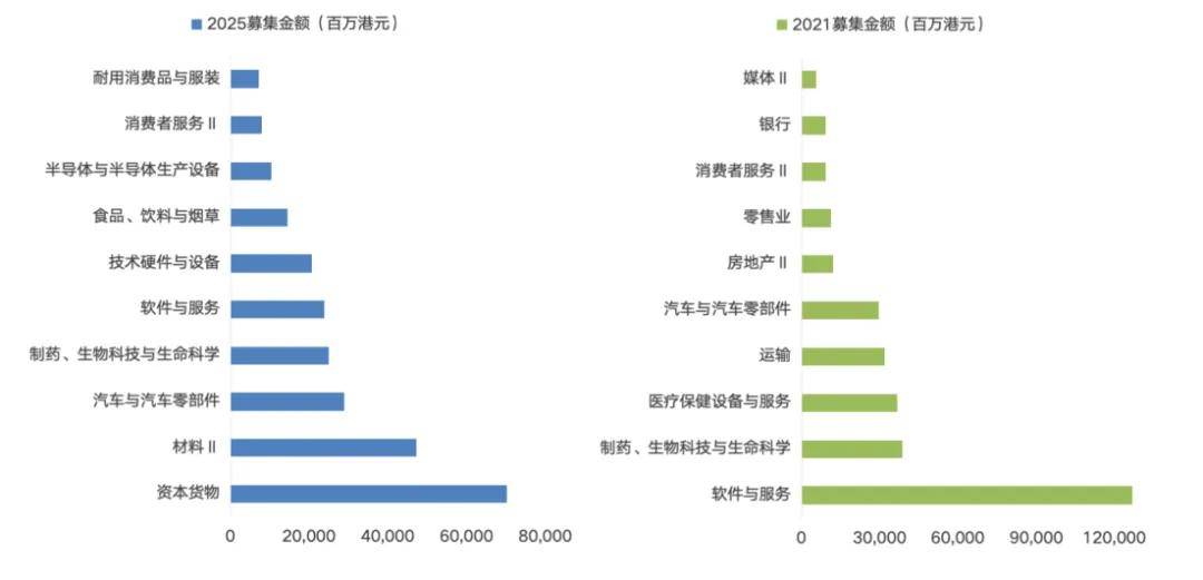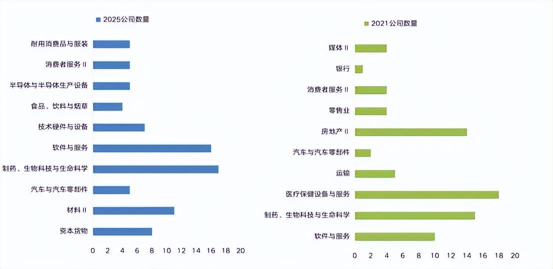 2021年上市的公司主要分布在互联网、大医药、物业管理领域,以“软科技”为主导;而2025年上市的公司主要分布在资本货物、材料、汽零等“硬科技”行业。