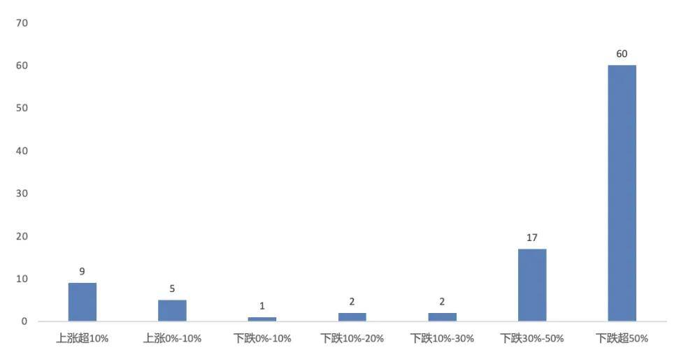 对2021年IPO,跌幅超过30%的77家公司的市盈率、归母净利润变动情况进行进一步统计,有36家公司在2020-2024年的归母净利润取得正增长,故将这些公司定义为“估值回调”导致股价下行;有41家公司归母净利润出现下降的情况,故将这些公司定义为“利润下滑”导致股价下滑。