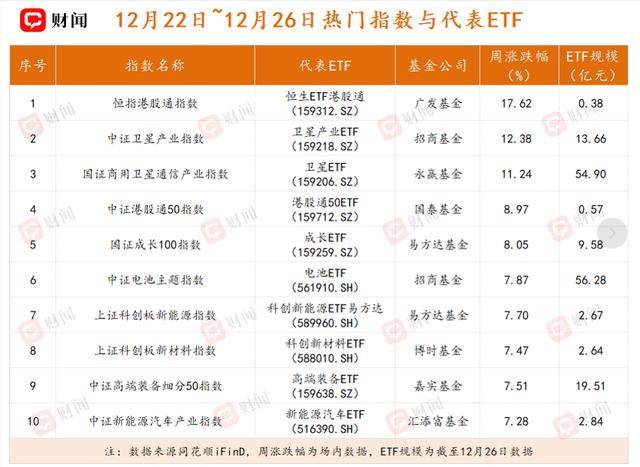商业航天相关概念迎来大涨,卫星产业ETF(159218.SZ)周内涨幅超过10%,恒生ETF港股通(159312.SZ)净值增长同样值得关注,单周涨幅超过17%。