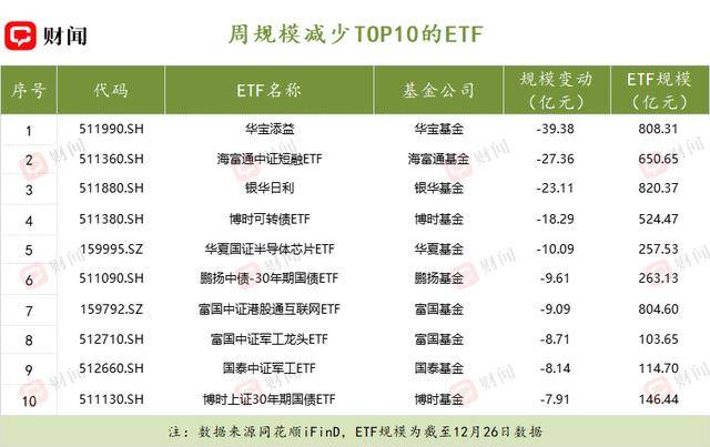 资金主要从货币、短融及部分主题ETF中流出。华宝添益(511990.SH)、海富通短融ETF(511360.SH、银华日利(511880.SH)等上周规模减少量居前。此外,半导体、军工等行业主题ETF,以及部分长端国债ETF延续了此前的下滑趋势,一定程度反映出年末流动性环境变化下的资金腾挪。
