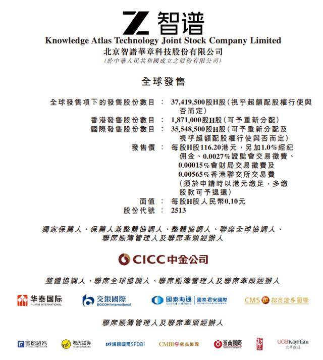 12月30日,北京智谱华章科技股份有限公司(02513)在港交所公告,在港上市拟发行37,419,500股H股(视乎发售量调整权及超额配股权行使与否而定),按每股116.2港元的发行价计算,扣除相关费用后,募资规模预计将达43亿港元,IPO市值预计超511亿港元。预期H股将在明年1月8日开始交易。