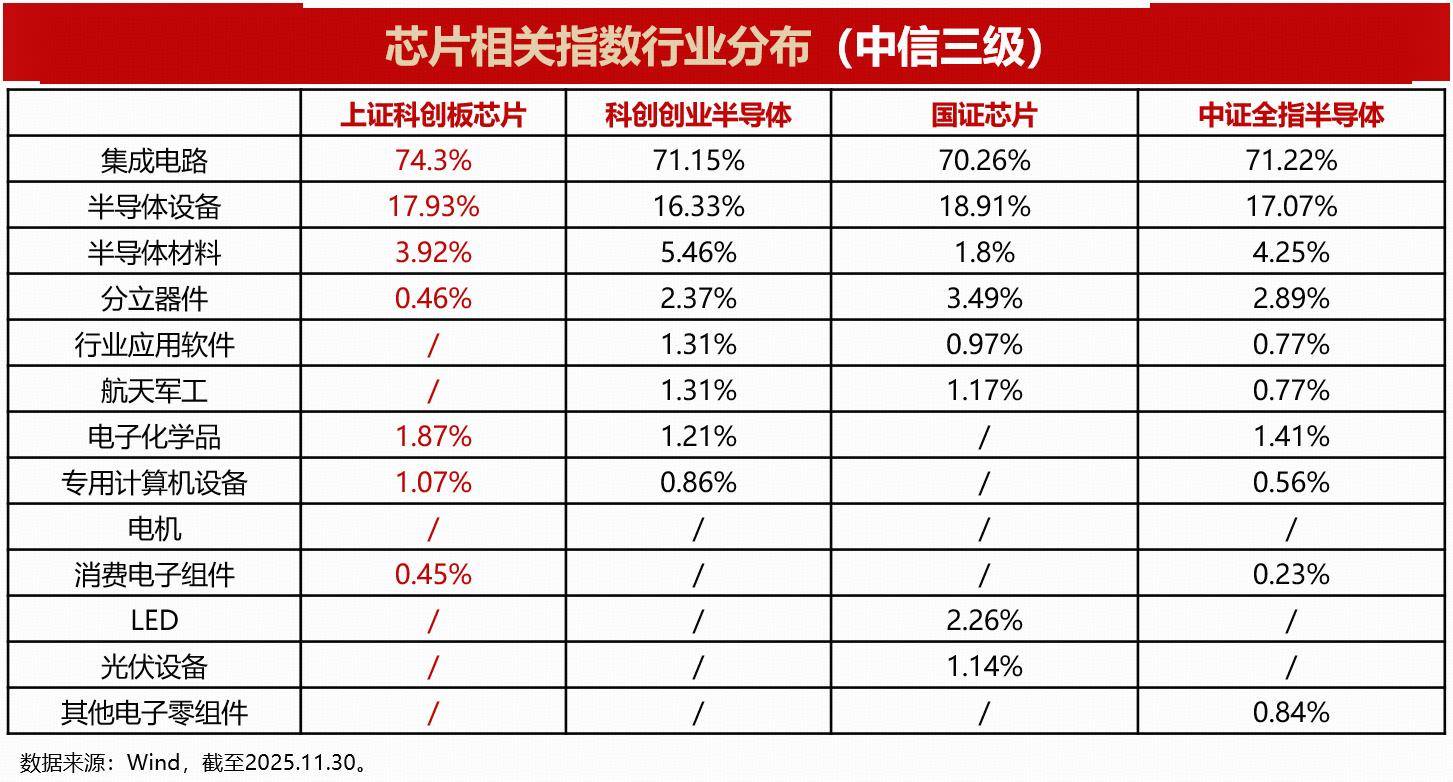 截至2025年11月末,上证科创板芯片指数成份股聚焦芯片上游、中游,在芯片设计、半导体材料与设备领域占比合计达80.48%(其中芯片设计领域占比57.09%),芯片核心环节占比更大,硬科技含量、技术壁垒更高。集成电路产业是信息技术产业的核心,上证科创板芯片指数锚定芯片产业核心环节,在集成电路领域权重占比达74.3%,明显高于科创创业半导体、国证芯片、中证全指半导体等同类指数。