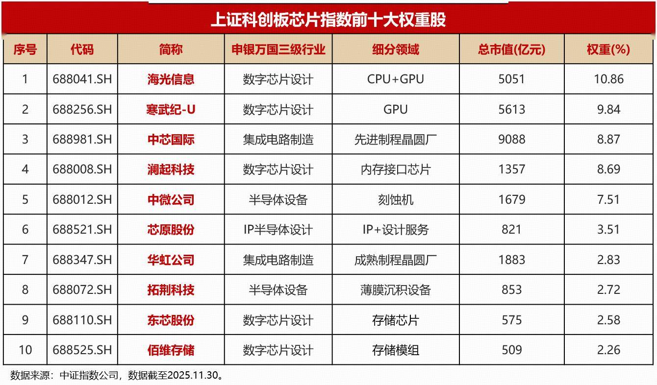 截至2025年11月末,上证科创板芯片指数成份股涵盖50只国产芯片产业链公司,其中国产芯片龙头——海光信息权重占比达10.86%,寒武纪权重占比9.84%,中芯国际权重占比8.87%。该指数的编制规则设置单个成份股权重上限为10%,该指数样本每季度调整一次,其挂钩ETF产品日涨跌幅限制为20%。