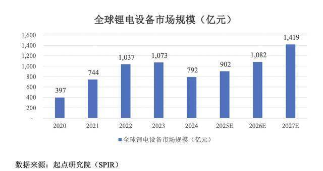 根据起点研究院(SPIR)数据,2024年全球锂电池设备规模为792亿元,同比下降26.2%。下降主要原因为下游锂电池企业扩产进度放缓及锂电设备价格下降。