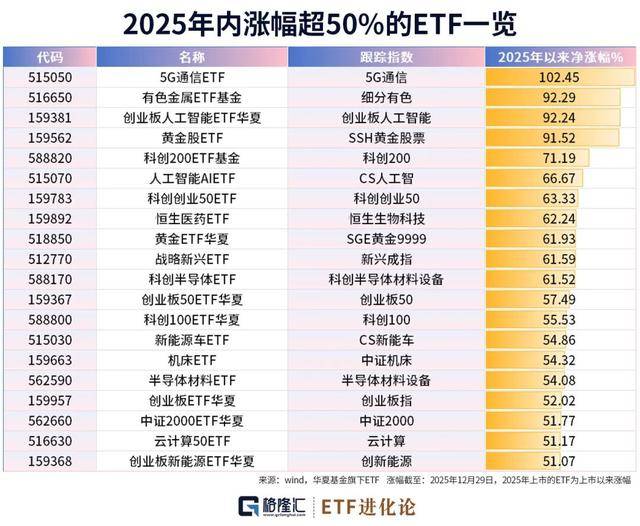5G通信ETF年内翻倍,涨幅达102%;有色金属ETF基金、创业板人工智能ETF华夏、黄金股ETF涨幅均超90%;人工智能AIETF、恒生医药ETF、黄金ETF华夏、科创半导体ETF等涨幅超60%。