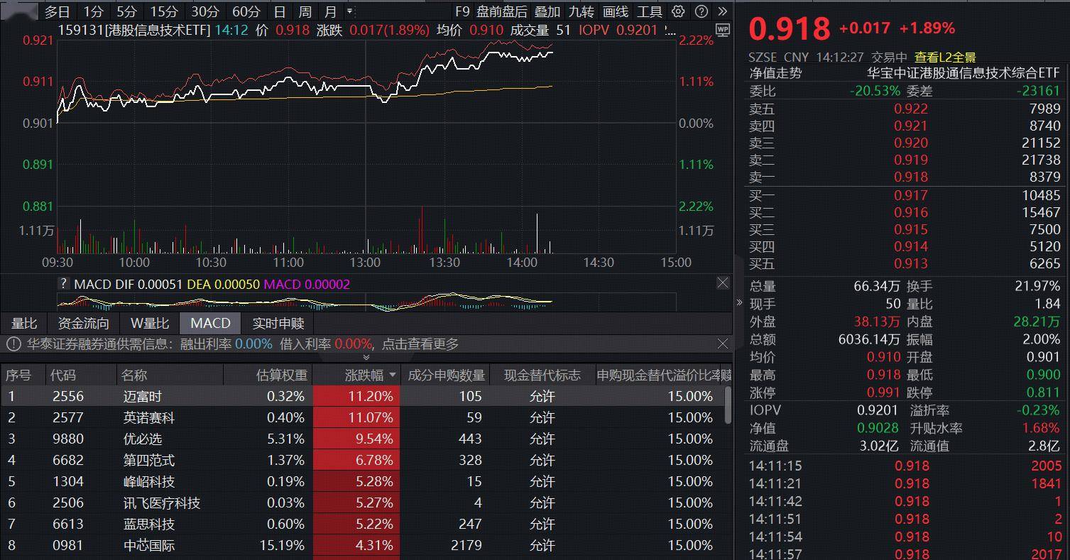 12月30日午后,港股硬科技逆市走高,迈富时、英诺赛科涨超11%,优必选涨超9%,第四范式涨超6%,中芯国际大涨超4%。全市场首只聚焦“港股芯片”产业链的港股信息技术ETF(159131)午后震荡走高,现涨1.89%,实时成交额超5700万元。