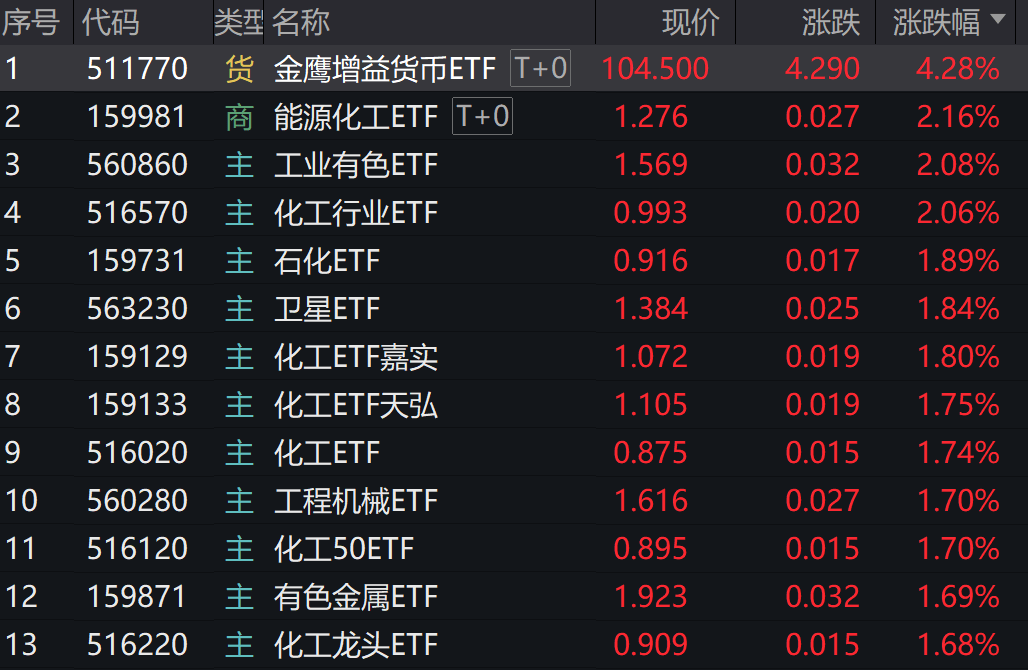 ETF方面,化工ETF霸榜。能源化工ETF(159981)、化工行业ETF(516570)双双涨超2%,化工ETF嘉实(159129)、化工ETF天弘(159133)等基金跟涨。