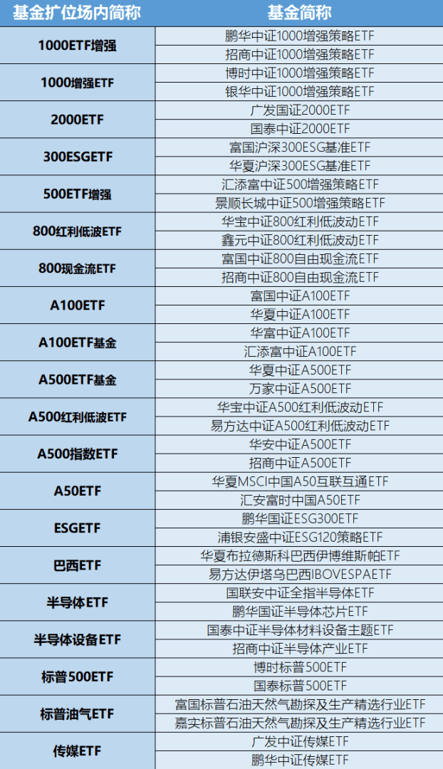 如跟踪上证180指数的ETF,成立于2006年4月13日的华安上证180ETF和成立于2025年1月15日的平安上证180ETF的扩位场内简称分别为“上证180ETF”和“上证180ETF指数基金”。