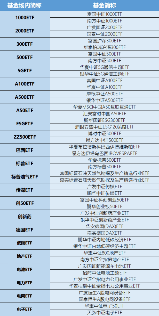 据了解,早期沪深交易所对ETF场内短简称的字数有严格限制(通常不超过4个汉字),难以展现产品特征。如跟踪沪深300指数的ETF,富国基金与华泰柏瑞基金的产品场内简称均为“300ETF”。