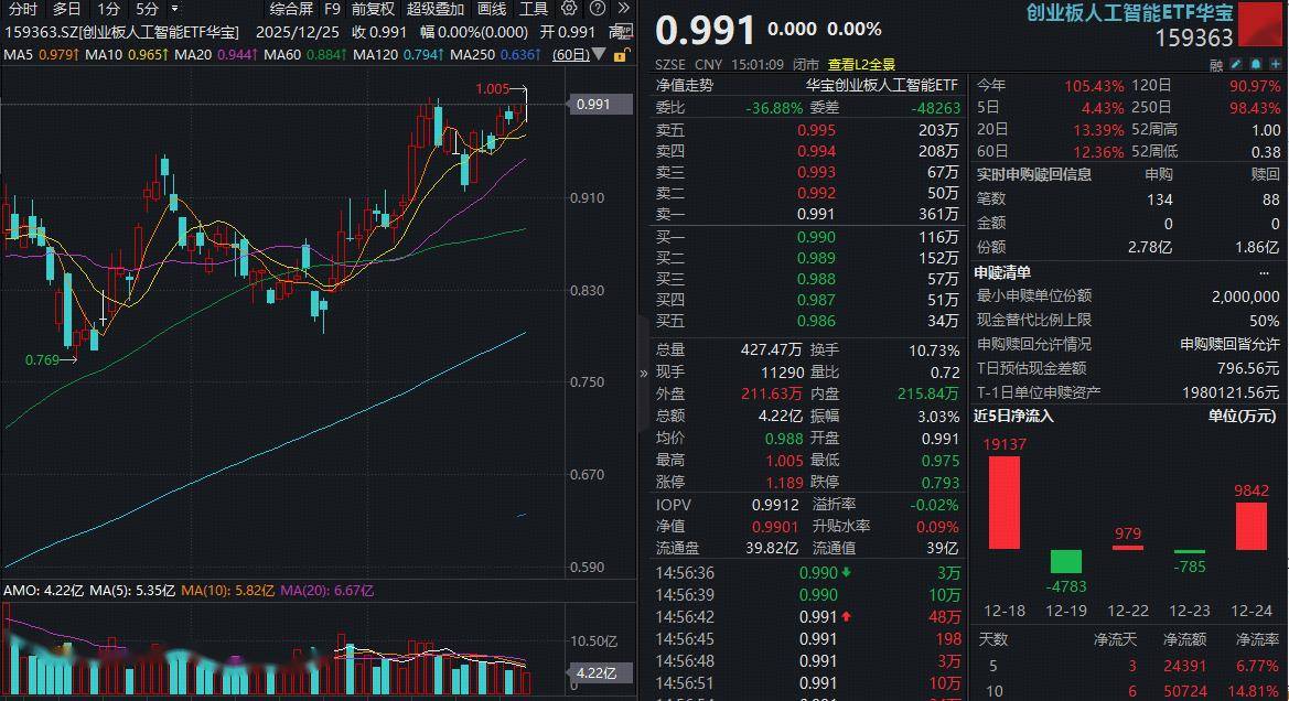 同类对比看,截至12月29日,创业板人工智能ETF华宝(159363)最新规模超38亿元,近1个月日均成交额超6亿元,在跟踪创业板人工智能指数的7只ETF中排行第一!