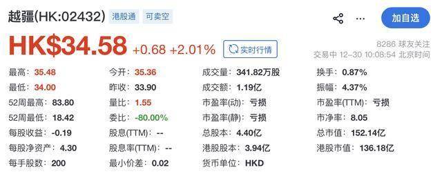 越疆于2024年12月23日在港交所挂牌上市。截至发稿时,其报34.58港元,涨2.01%,总市值约152.14亿港元。