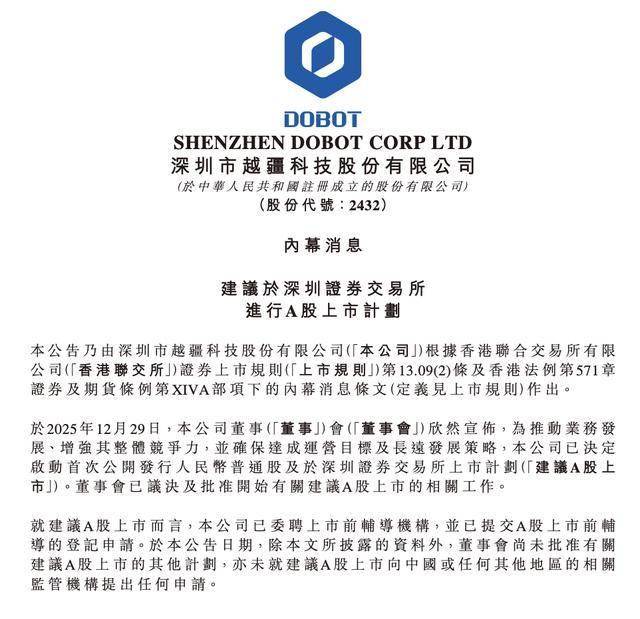 瑞财经 吴文婷12月29日,越疆科技发布公告称,为推动业务发展、增强其整体竞争力,并确保达成运营目标及长远发展策略,公司已决定启动首次公开发行人民币普通股及于深圳证券交易所上市计划(建议A股上市)。董事会已议决及批准开始有关建议A股上市的相关工作。
