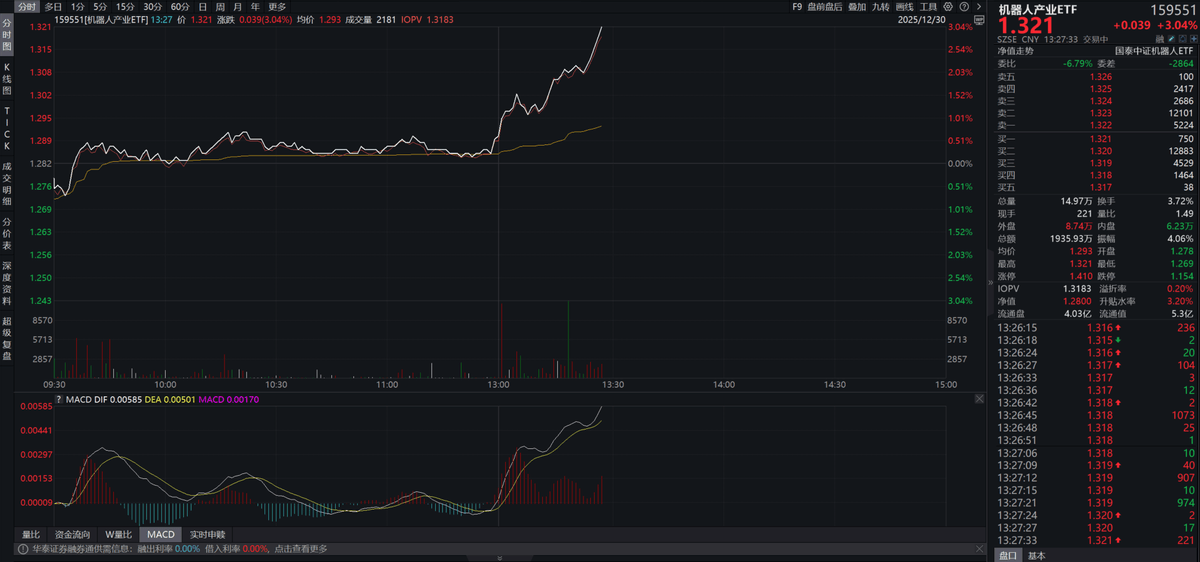 消息面,宇树科技发布消息称,其全国首店将于12月31日在北京京东MALL开业。机器人产业板块爆发,相关产品机器人产业ETF(159551)涨超2.4%。