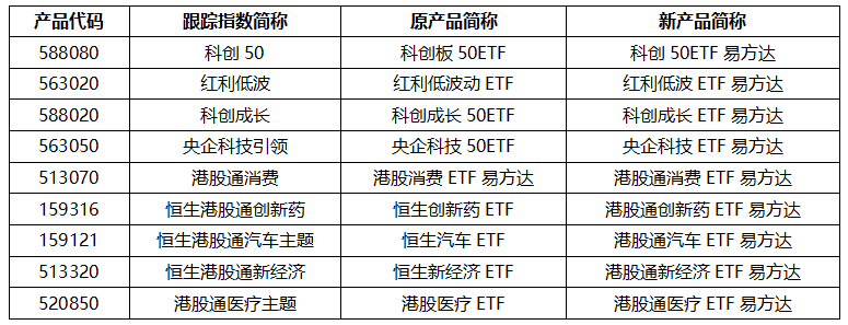 例如,对于通过港股通机制投资港股的行业主题ETF,在简称中加入“港股通”字样,如将跟踪恒生港股通创新药指数的“恒生创新药ETF”调整为“港股通创新药ETF易方达”;去掉冗余汉字或数字,如将跟踪科创50指数的“科创板50ETF”调整为“科创50ETF易方达”,将跟踪科创成长指数的“科创成长50ETF”更名为“科创成长ETF易方达”。