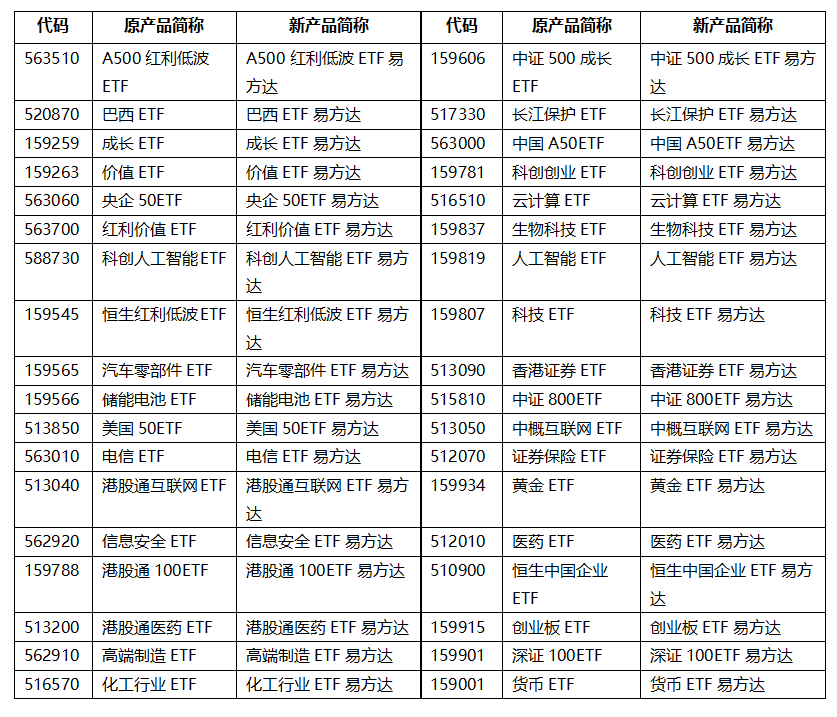 目前,多家基金公司已陆续启动相关调整工作,易方达基金成为业内首家完成全量ETF规范命名的机构。事实上,在交易所发布修订规则前,易方达基金已经开始着手解决ETF简称不规范问题,于2025年1月率先对17只ETF进行了批量更名,随后又在2月完成第二批8只ETF简称的调整。截至目前,该公司旗下已有A500ETF易方达(159361)、红利ETF易方达(515180)等超70只ETF统一按“标的指数+ETF+易方达”的规则命名。