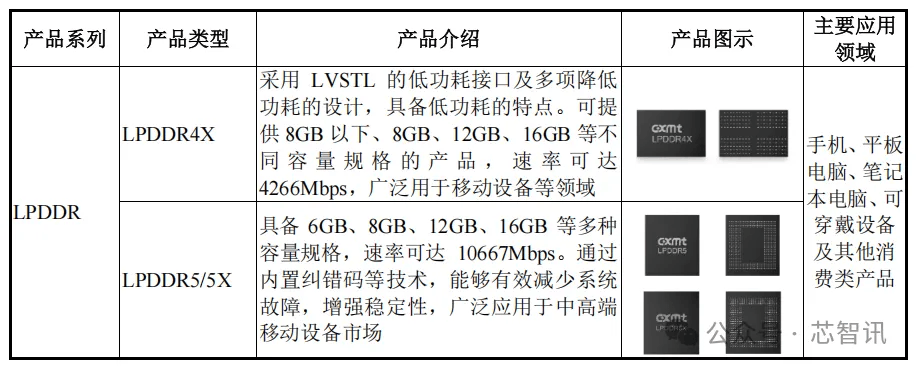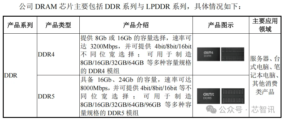 长鑫科技提主要供DRAM 晶圆、DRAM 芯片、DRAM 模组等多元化产品方案,产品主要覆盖DDR、LPDDR两大主流系列,目前已完成从DDR4、LPDDR4X到DDR5、LPDDR5/5X的产品覆盖和迭代,产品广泛应用于服务器、移动设备、个人电脑、智能汽车等市场领域。