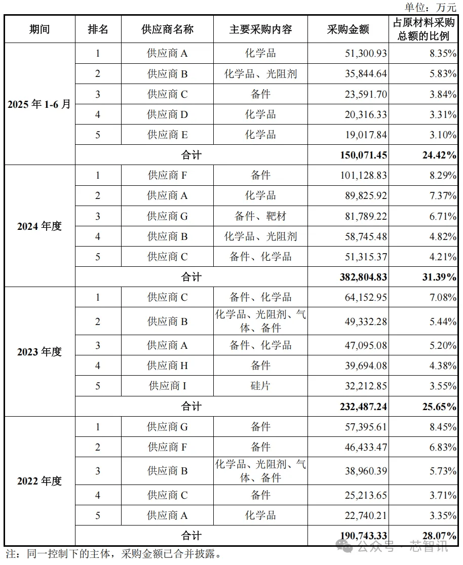 报告期内,长鑫科技生产经营使用的主要原材料包括化学品、备件、光阻剂、硅片、气体和靶材。长鑫科技向前五大原材料供应商采购金额占当期原材料采购总额的比例分别为28.07%、25.65%、31.39%和24.42%。显然,长鑫科技对于前五大供应商的依赖程度较低。