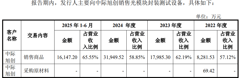 该公司近六成收入来自中际旭创。招股书显示,报告期内,猎奇智能向前五大客户的销售收入占营收的比重分别为81.79%、93.17%、82.83%和79.38%,其中对中际旭创的销售收入占比分别为57.12%、62.19%、58.85%和65.55%。