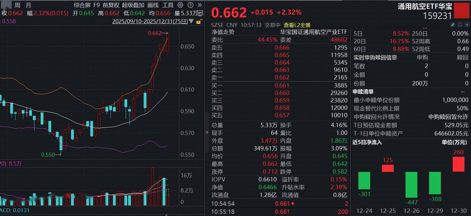 2025年最后一个交易日,卫星及航空航天强势领涨!爱乐达大涨逾17%,北斗星通10%涨停,广联航空涨超9%,航天电子、中国卫星双双涨超8%。一键布局商业航天+卫星导航+低空经济+大飞机的通用航空ETF华宝(159231)场内价格现涨2.32%刷新上市新高,强势冲击六连阳!盘中获实时净申购200万份。