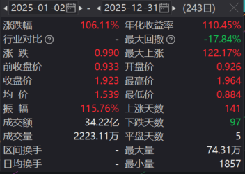 根据Wind数据,截至2025年12月31日收盘,矿业ETF(561330)年内涨幅达106.11%,位居全市场有色矿业类ETF首位、全市场ETF里面第三。