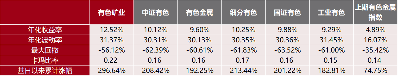 根据Wind数据,截至2025年12月31日,中证有色金属矿业主题指数自基日(2013年12月31日)以来,累计涨幅296.64%,年化收益率12.52%,领先同类指数。