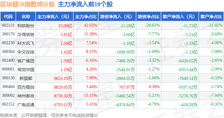 资金流向方面,区块链50(399286)指数成份股当日主力资金净流入合计25.02亿元,游资资金净流出合计14.28亿元,散户资金净流出合计10.74亿元。成份股资金流向详情见下表:
